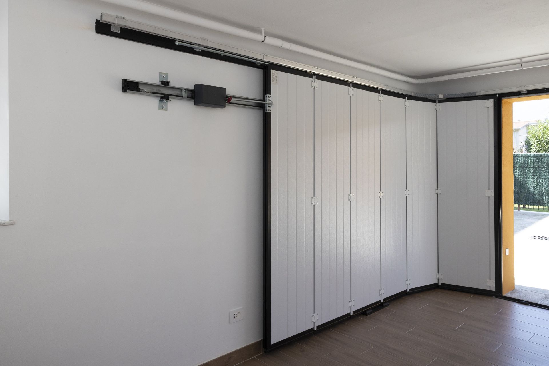 scorrono su guide verticali che si curvano con precisione e si ripiegano parallelamente al soffitto, liberando completamente l’ingresso senza occupare spazio esterno o interno.